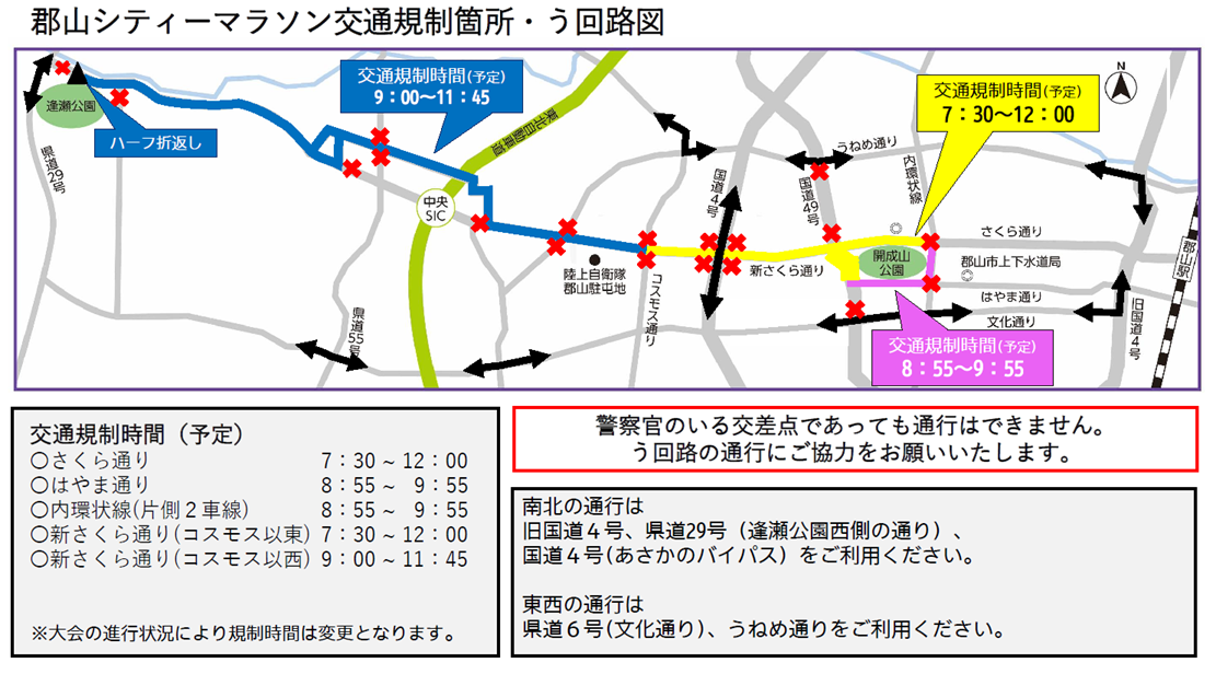 大会の開催に伴い、さくら通りなどコース沿線の交通を規制いたします。ご迷惑をおかけいたしますが、ご協力をお願いいたします。 交通規制の内容は道路状況などにより変更になる場合があります。